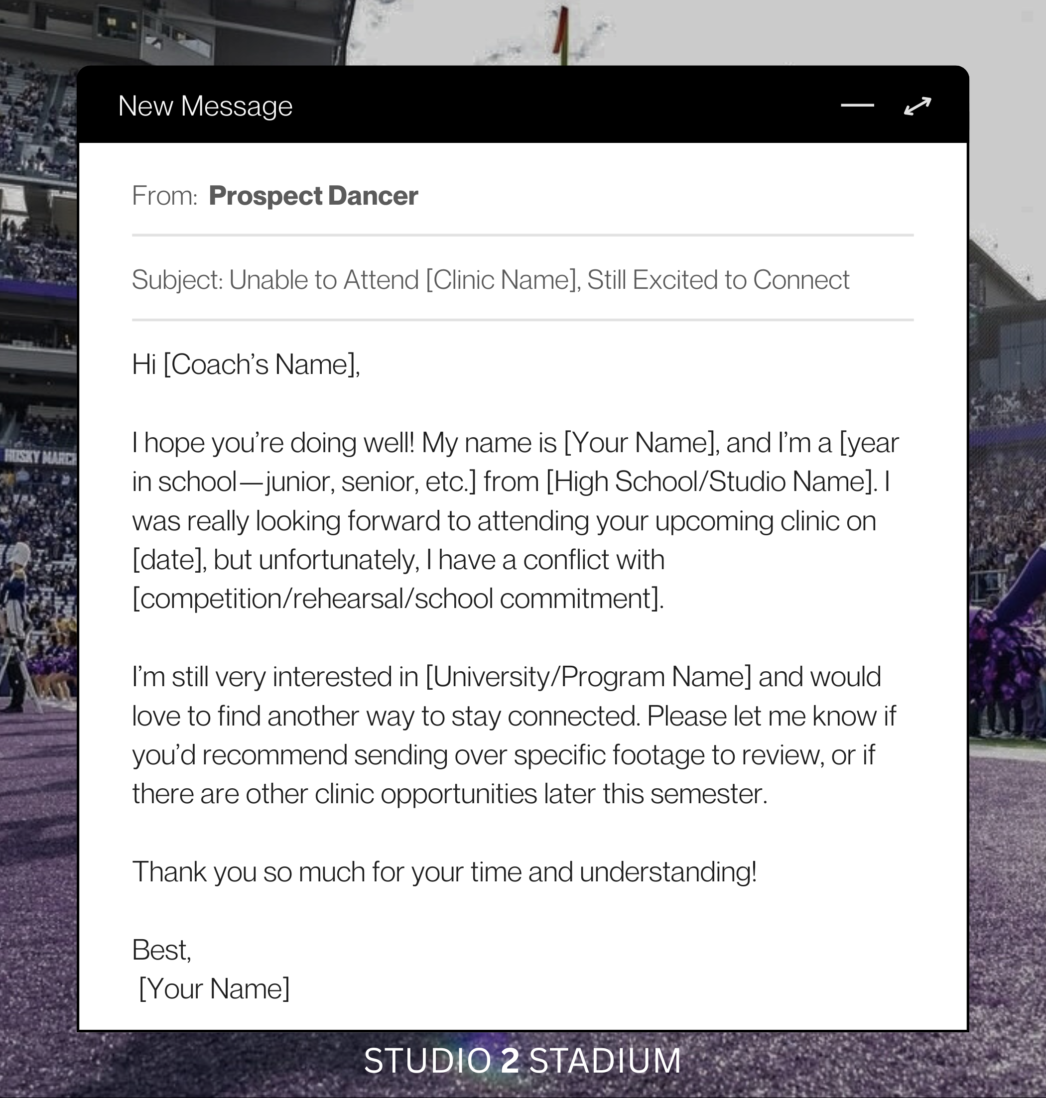 One of the biggest mistakes dancers make is staying silent when they can’t attend a clinic. Coaches understand dancers are juggling competitions, rehearsals, and school—they’ve been there themselves. What matters most is showing you’re responsible and respectful.